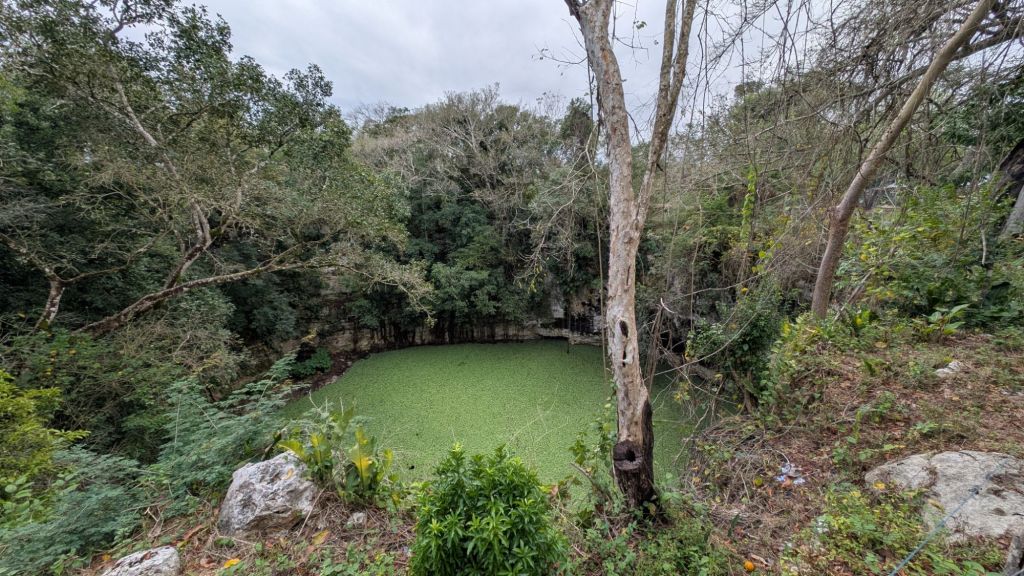 We returned to the bus and headed back to Valladolid, but the driver had one more hidden spot for us, and we visited a local Maya village which had a 3rd kind of cenote (we’d visited a closed one (cave) an open one…) and now a dead or dying one, which was basically a dried up cenote full of soil and vegetation instead.