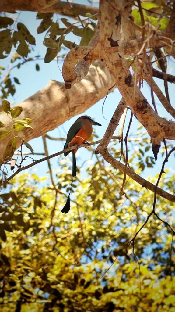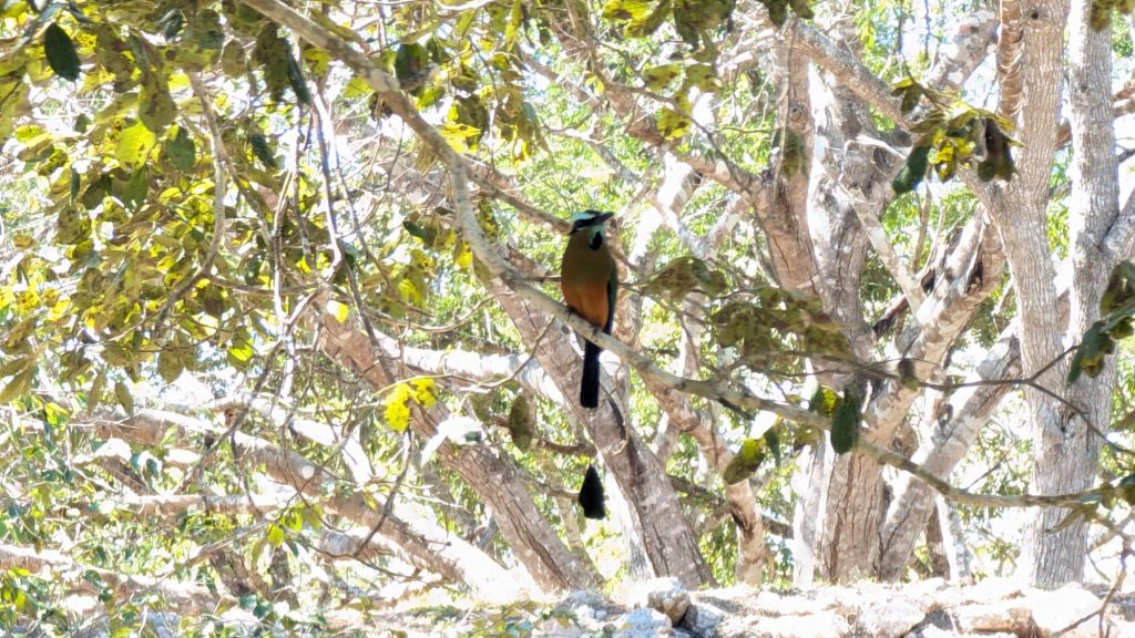 It wasn’t just the Maya ruins which were interesting to look at, there was also lots of wildlife too, including hundreds of iguanas sunning themselves on the rocks, bats and lots of birds, we saw some fancy looking woodpeckers with red heads, the tropical kingbird we saw in Valladolid a lot and to top it off, a beautiful motmot, which turned out to be the turquoise-browed mot mot, it was so pretty, with an orange belly and blue turquoise wings and a long tail which it kept flicking!