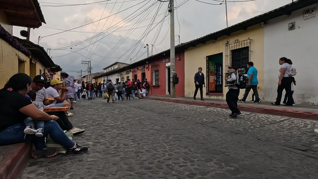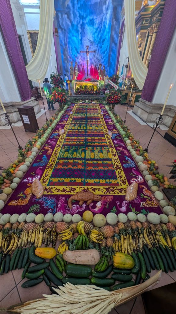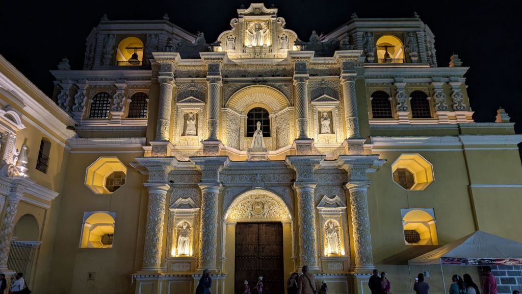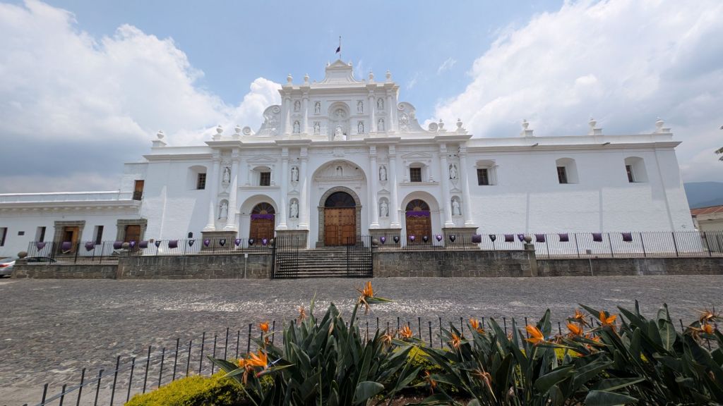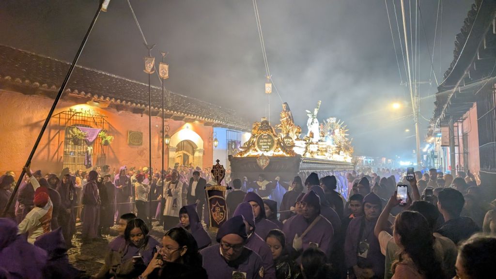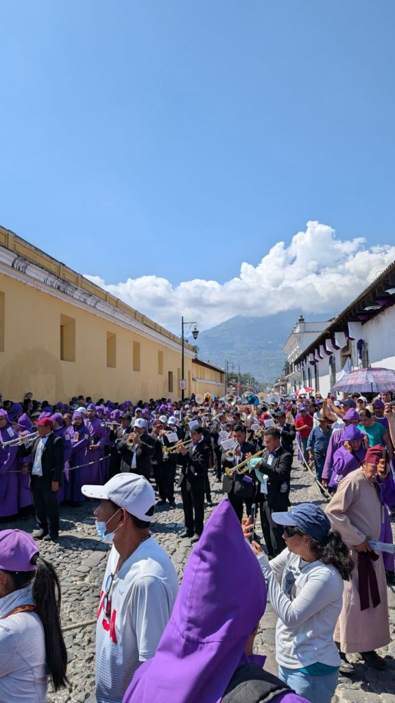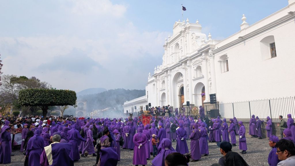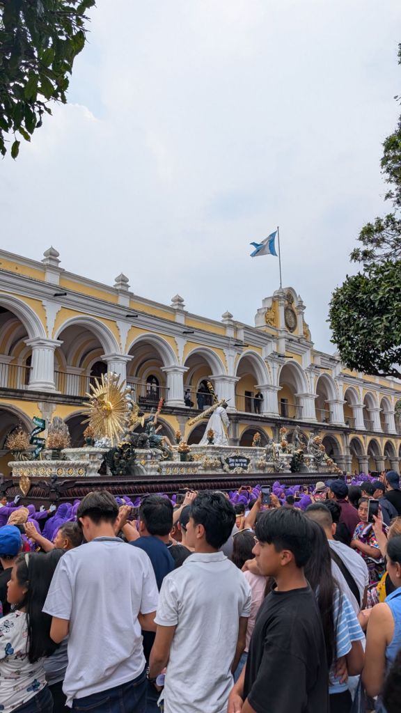 We arrived in the afternoon on a Sunday, and here in central America, there seems to be a Semana Santa procession every single Sunday in the run-up to Easter. So the streets were closed off to cars, and we managed to catch everyone in the main park central by the cathedral for a procession which was really cool to witness. The square was packed with locals and a marching band followed the paso (float).