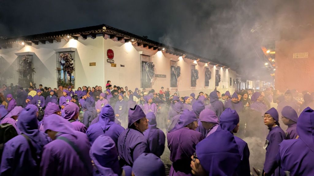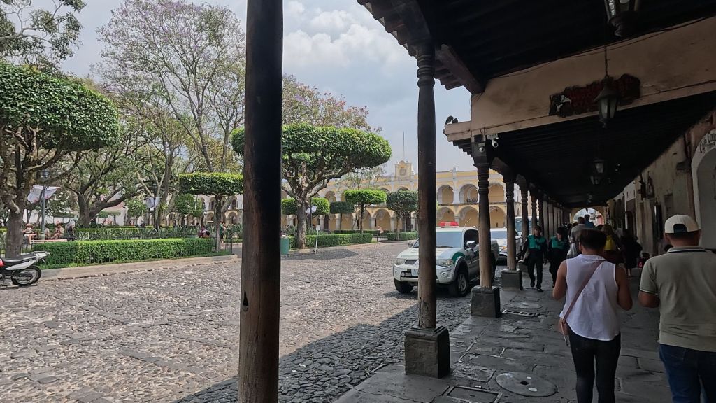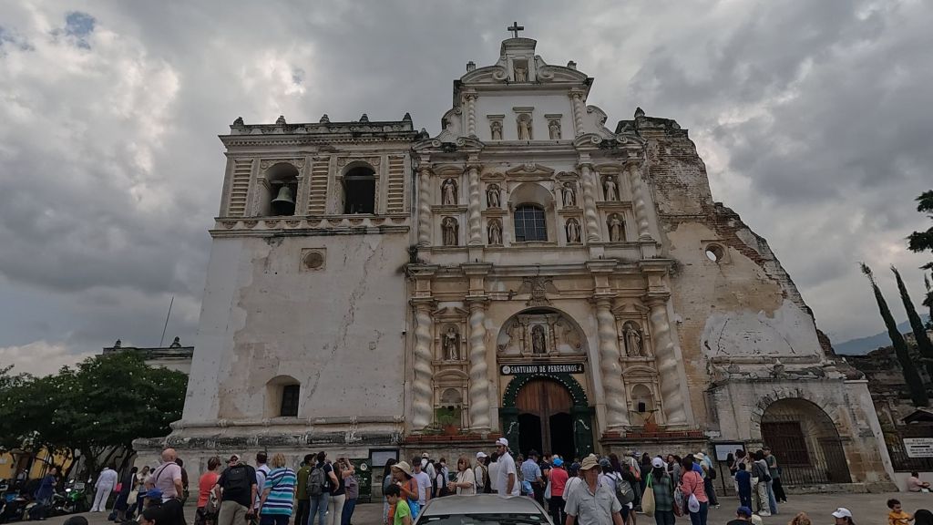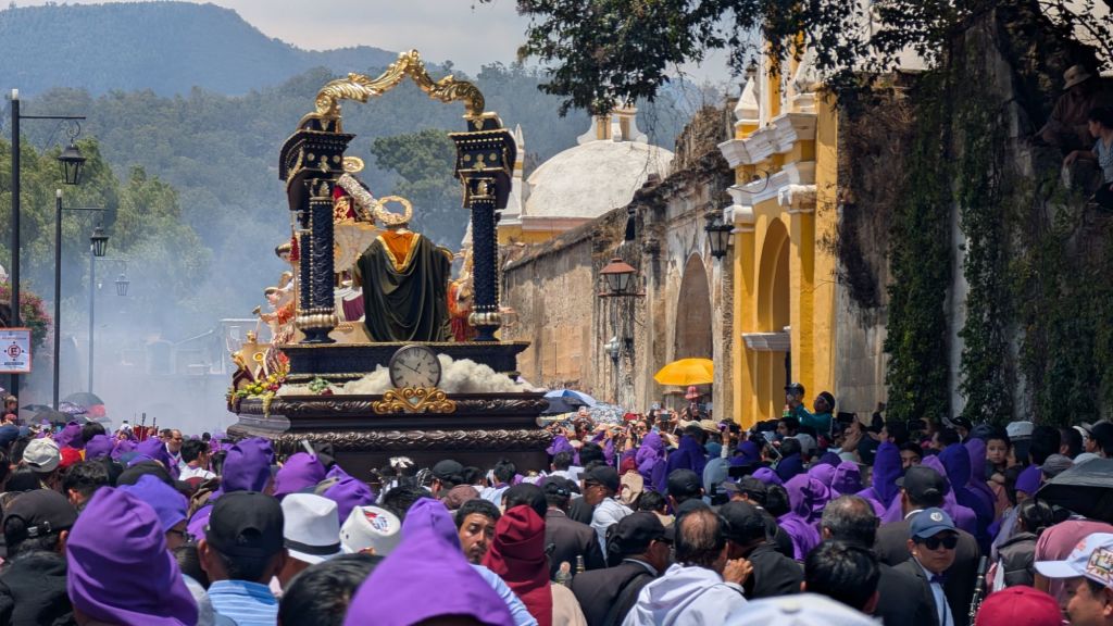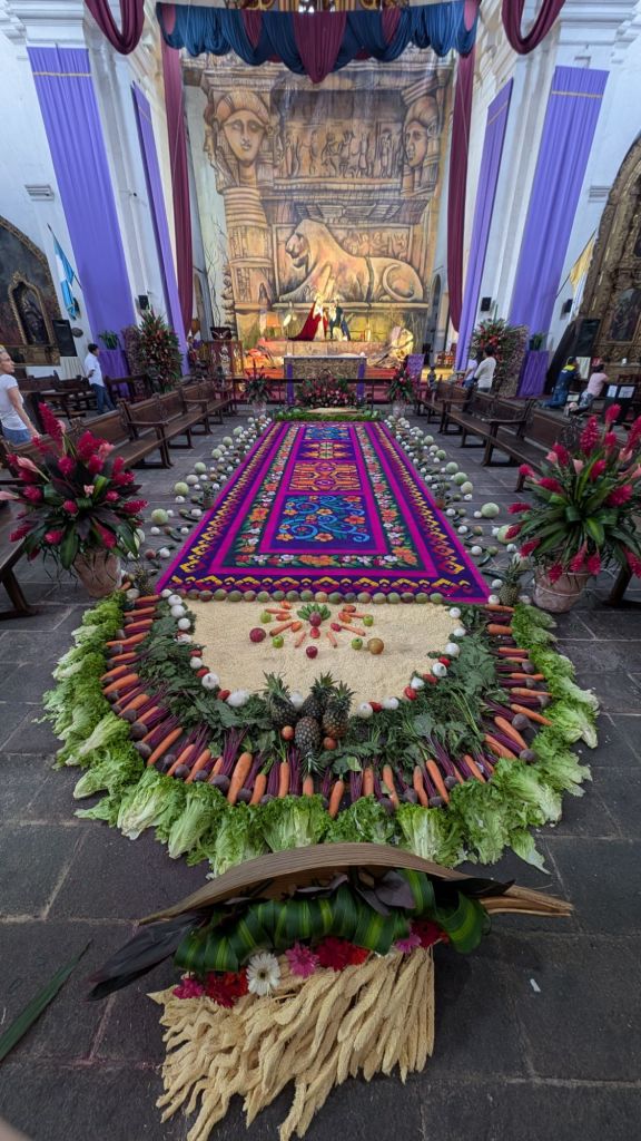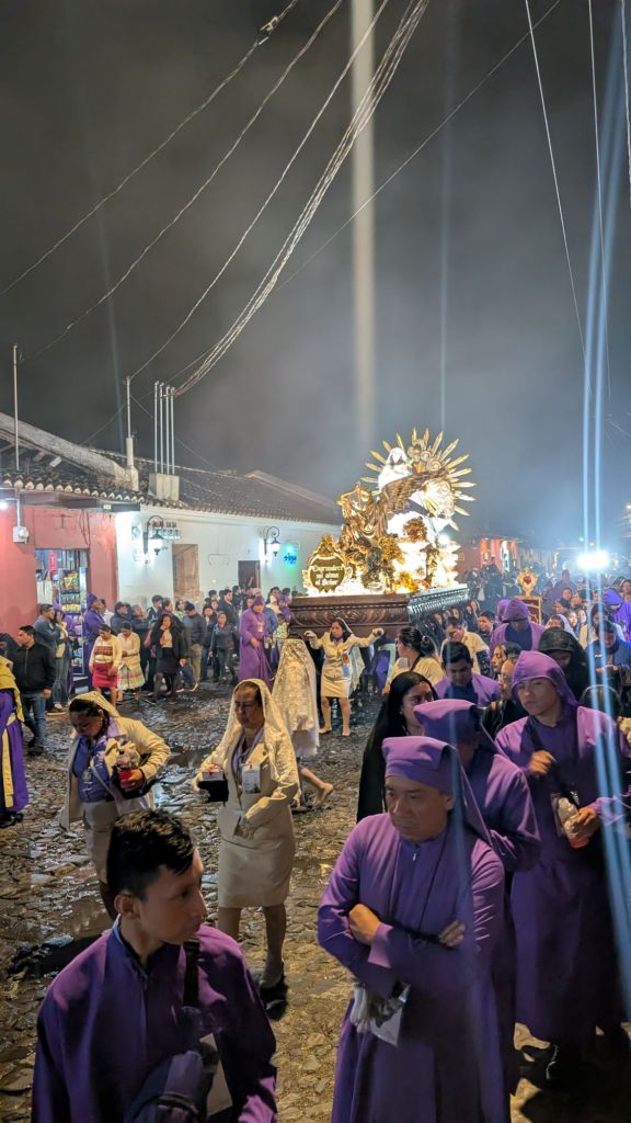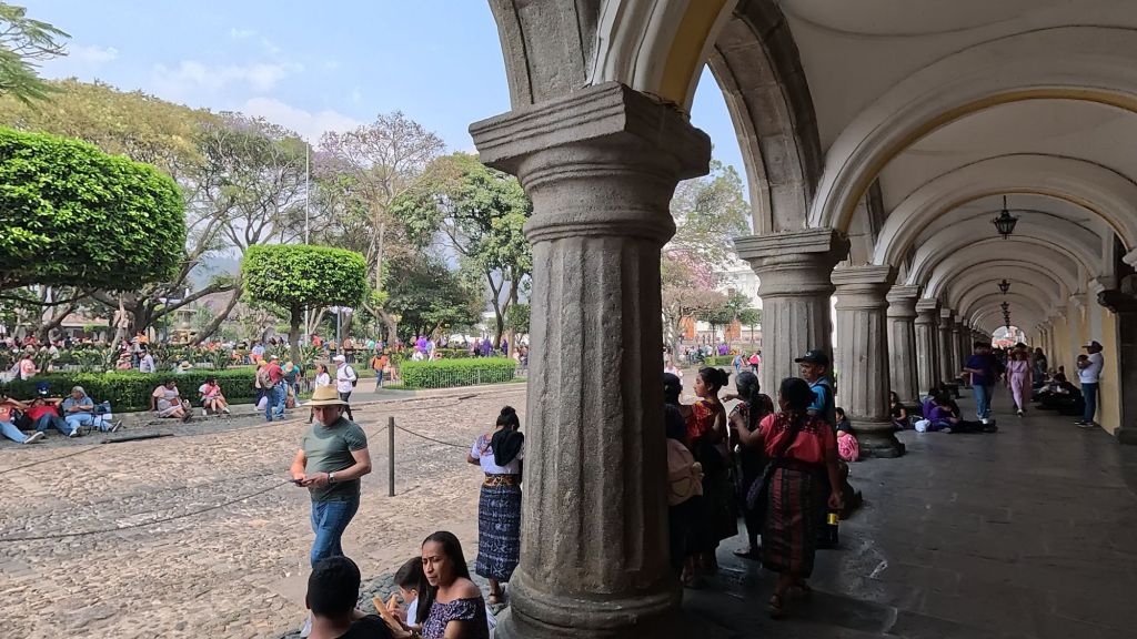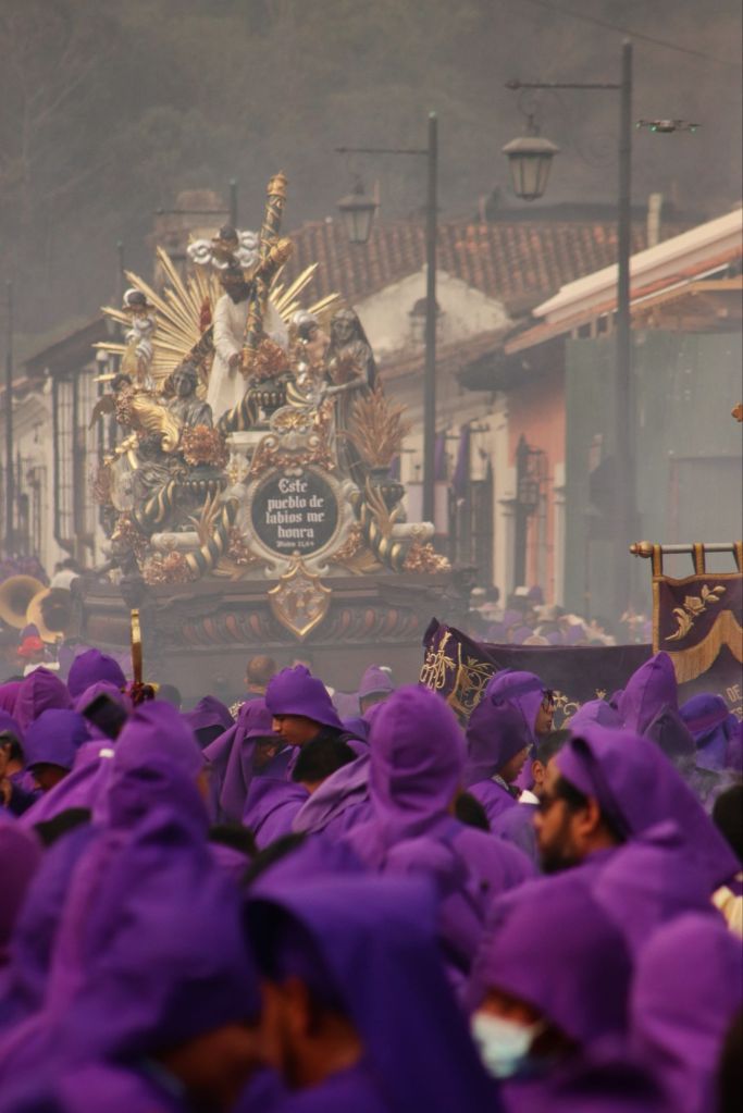We arrived in the afternoon on a Sunday, and here in central America, there seems to be a Semana Santa procession every single Sunday in the run-up to Easter. So the streets were closed off to cars, and we managed to catch everyone in the main park central by the cathedral for a procession which was really cool to witness. The square was packed with locals and a marching band followed the paso (float).