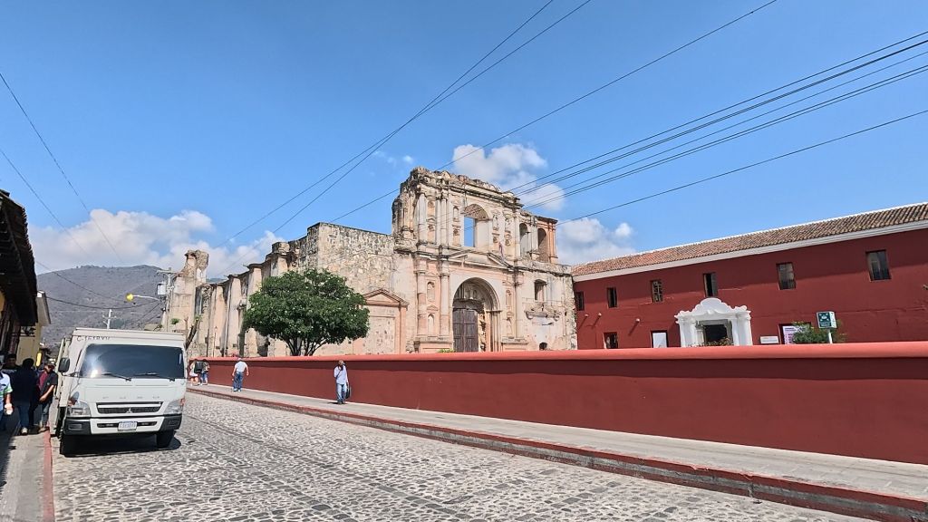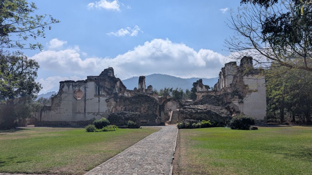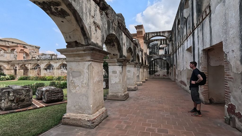 We were both really excited to visit Antigua, as we’d heard lots of good things about the town. It’s the old capital of Guatemala (Antigua just means “ancient”) so it’s the “ancient” capital, but after being hit by a few devastating earthquakes, the capital was moved (only about about 25km) to Guatemala City. So there are lots of ruins throughout the town from that time, lots of cool history and colonial buildings, and the town is very quaint and pretty, with cobbled streets and colourful facades.