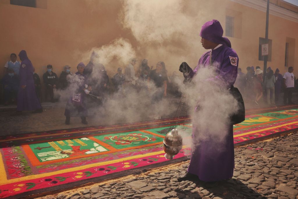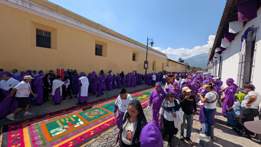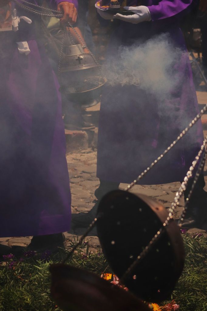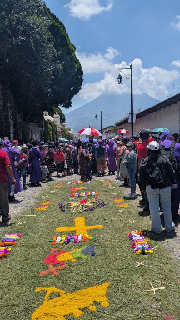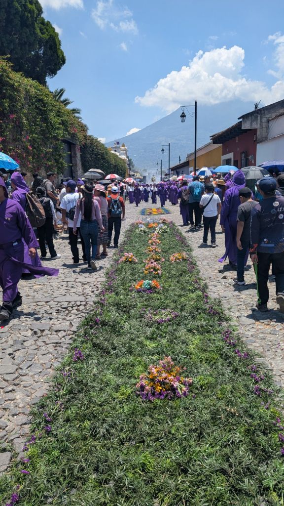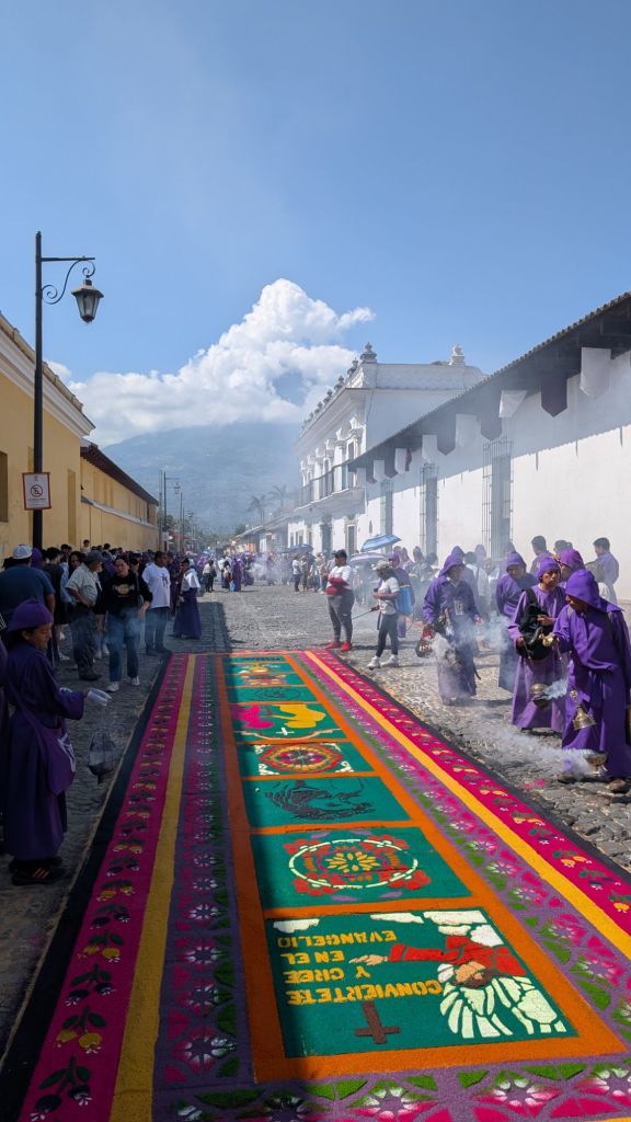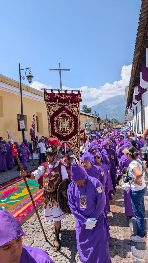 Apparently the procession today started at 3am and would continue all the way until midnight, the streets were PACKED!! Like actually crazy and we loved being able to witness the Alfombras, the procession and all the locals enjoying it. We think many people must have come to Antigua this weekend from all across the country. The town had a festival atmosphere and we caught the procession several times throughout the day as it continued on its path.