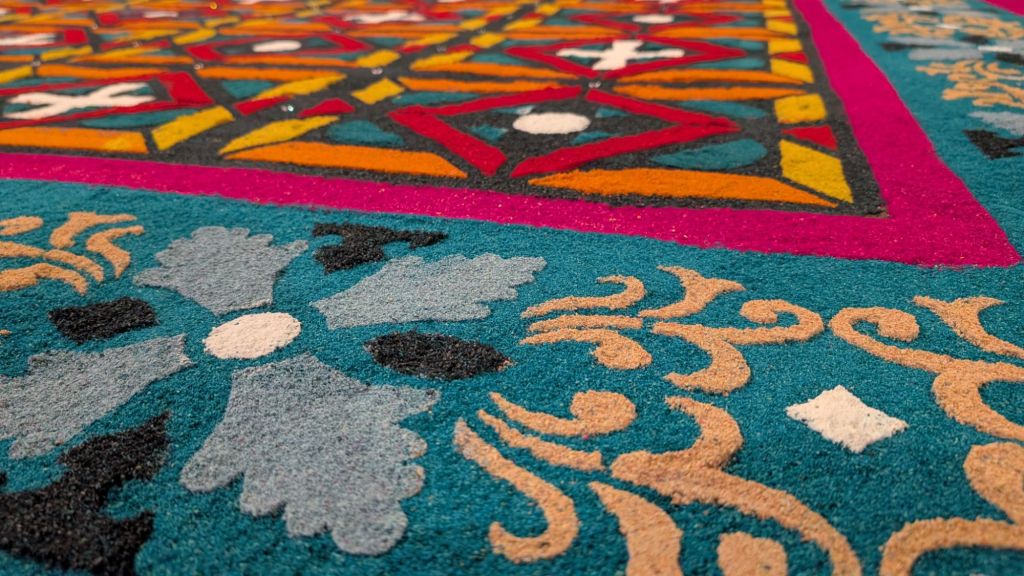 Alfombras are basically like carpets in the streets made from coloured sawdust, or sometimes completely natural materials like pine needles, chopped conifers, vegetables and flowers. They are so beautiful, and they pave the way for the procession, so once it gets there, they get walked all over and completely destroyed!! We rushed around the town to see as many as we could before they were destroyed.