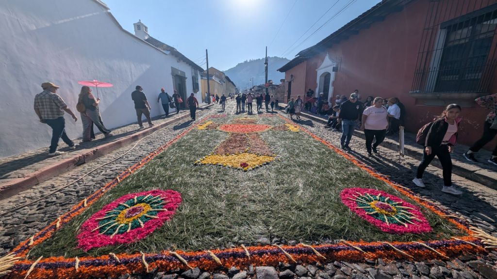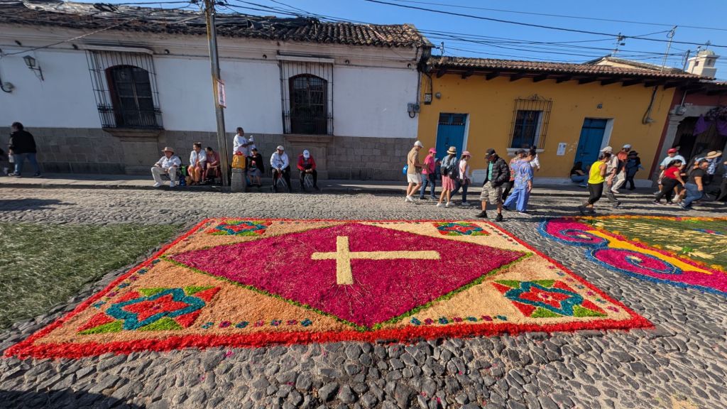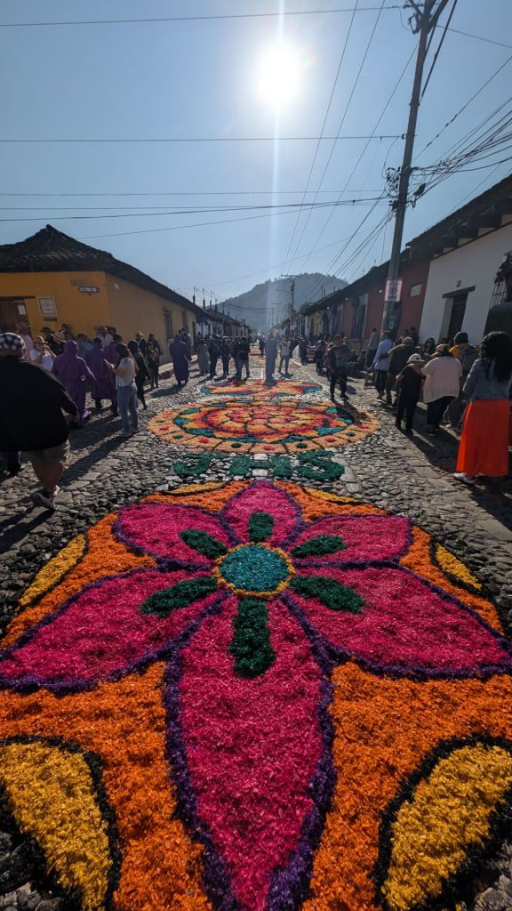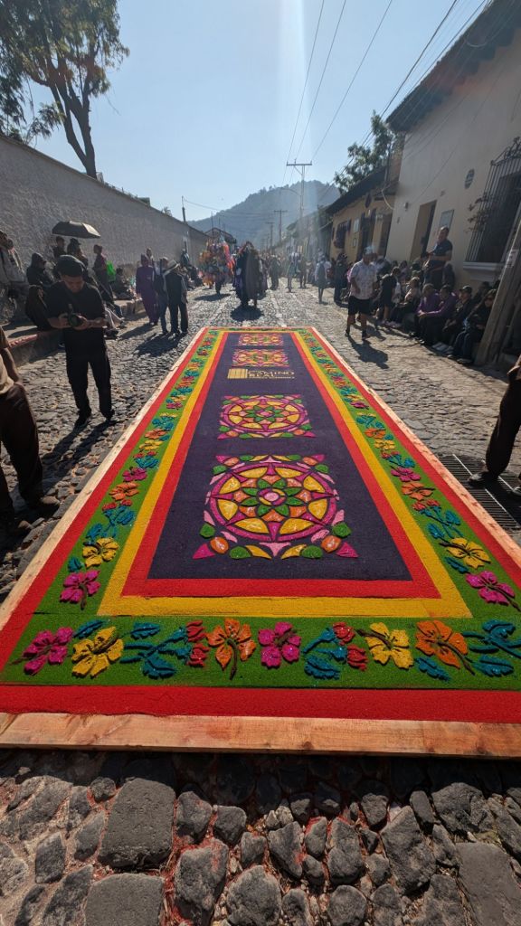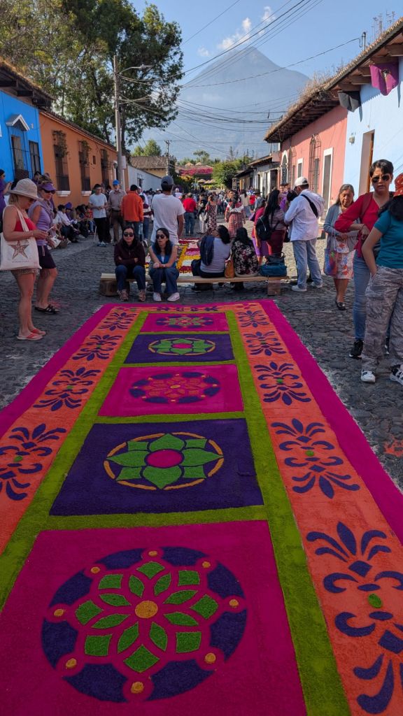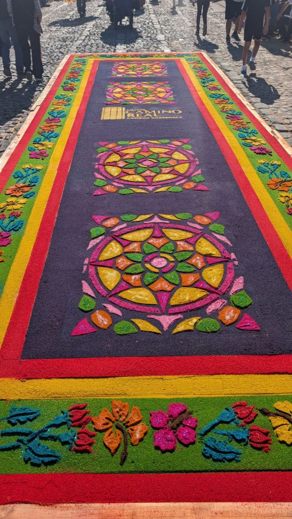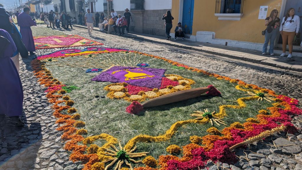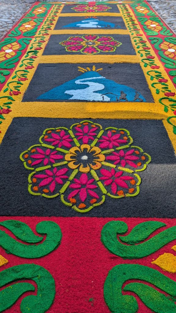 The final day was Sunday, and we’d planned to get up early and visit Finca El Pilar, a park up on the hillside which is apparently very good for hummingbirds, then come back to watch the Semana Santa processions in the afternoon, but when we got out into the street at 7:30am, we saw there were loads of Alfombras out in the roads ready for the procession… We had to stay here and look at them, some of them are INCREDIBLE!