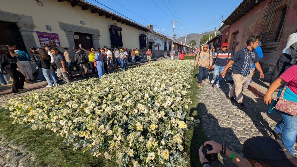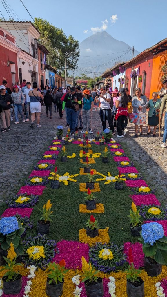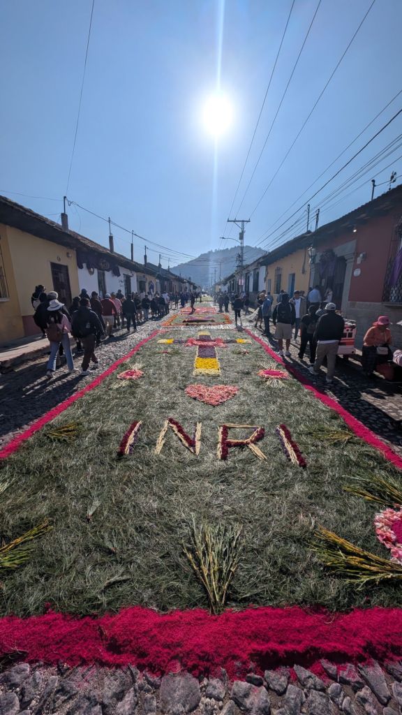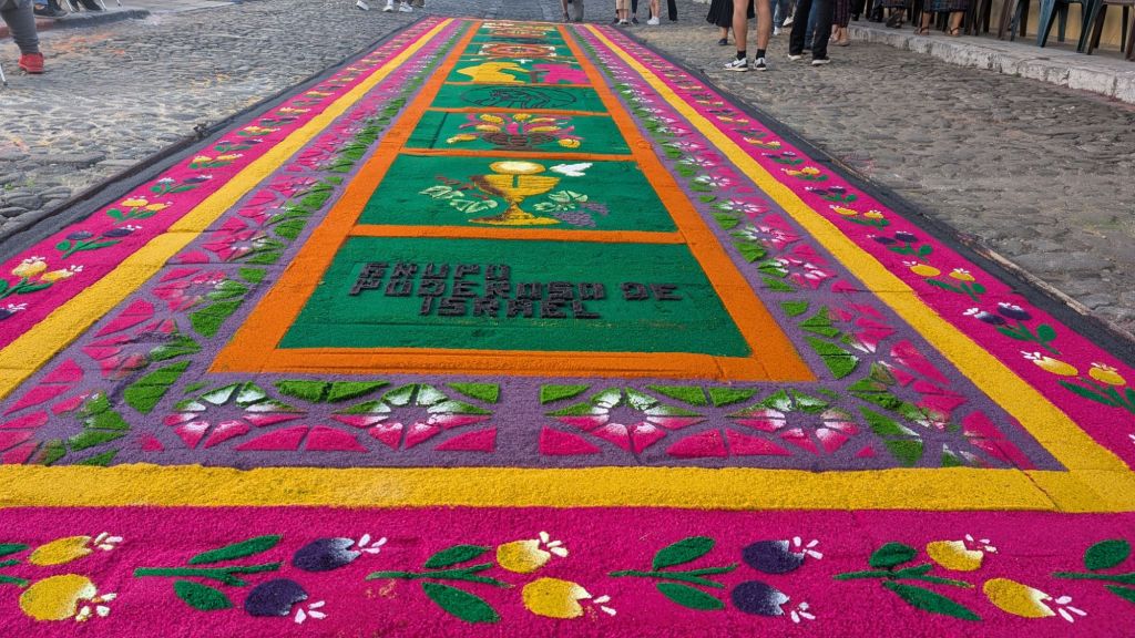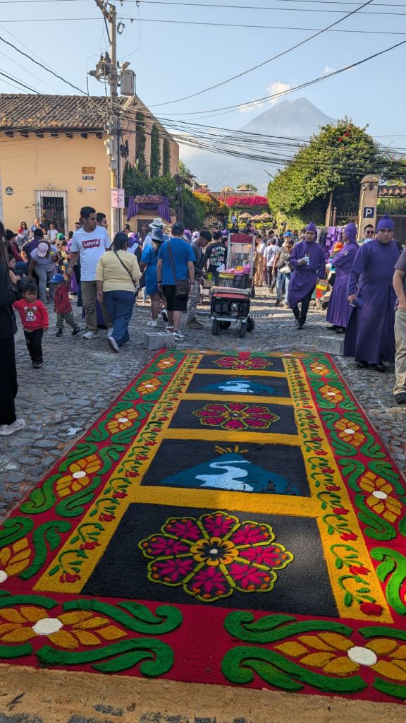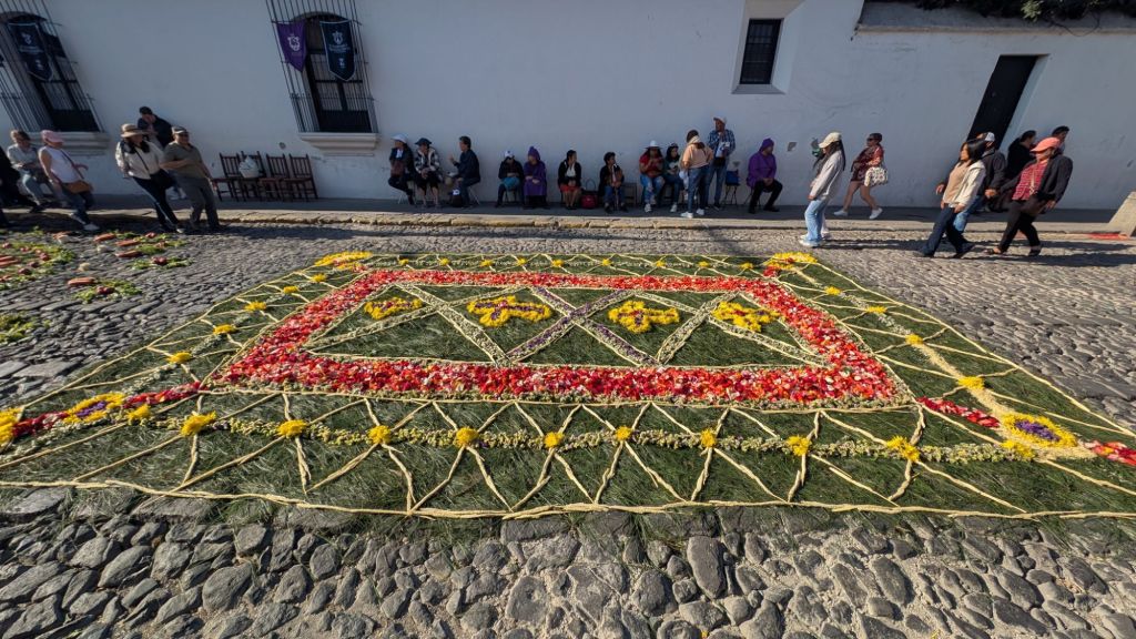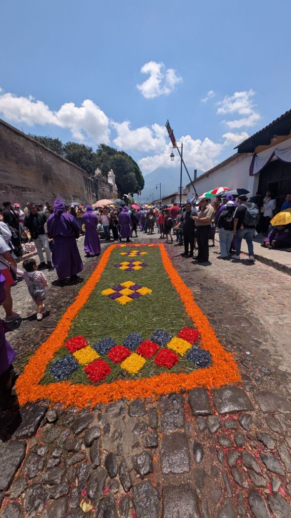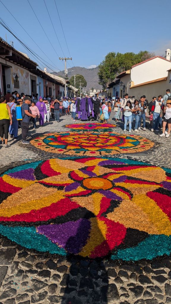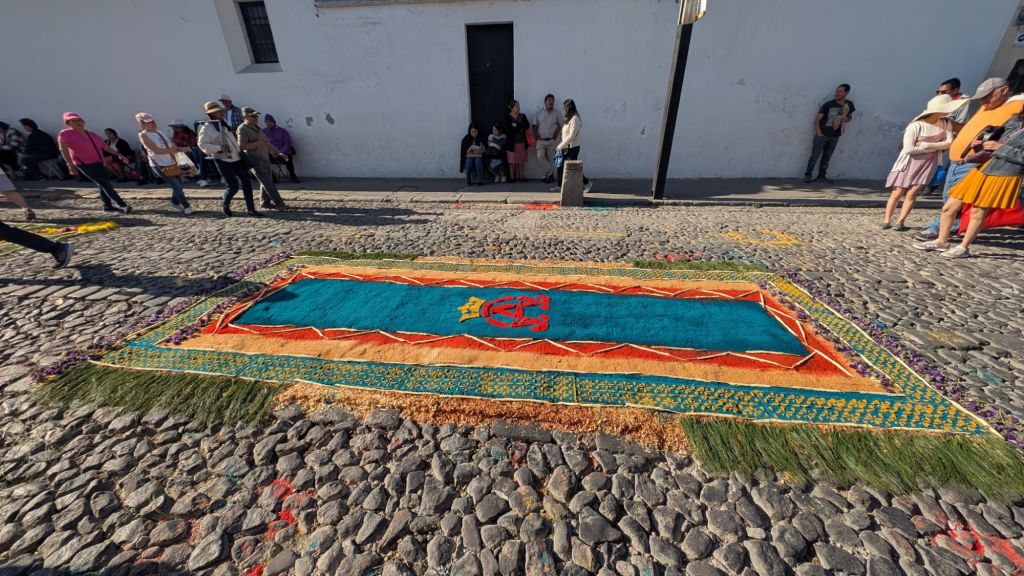The final day was Sunday, and we’d planned to get up early and visit Finca El Pilar, a park up on the hillside which is apparently very good for hummingbirds, then come back to watch the Semana Santa processions in the afternoon, but when we got out into the street at 7:30am, we saw there were loads of Alfombras out in the roads ready for the procession… We had to stay here and look at them, some of them are INCREDIBLE!