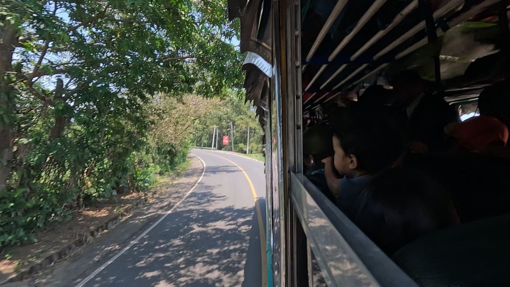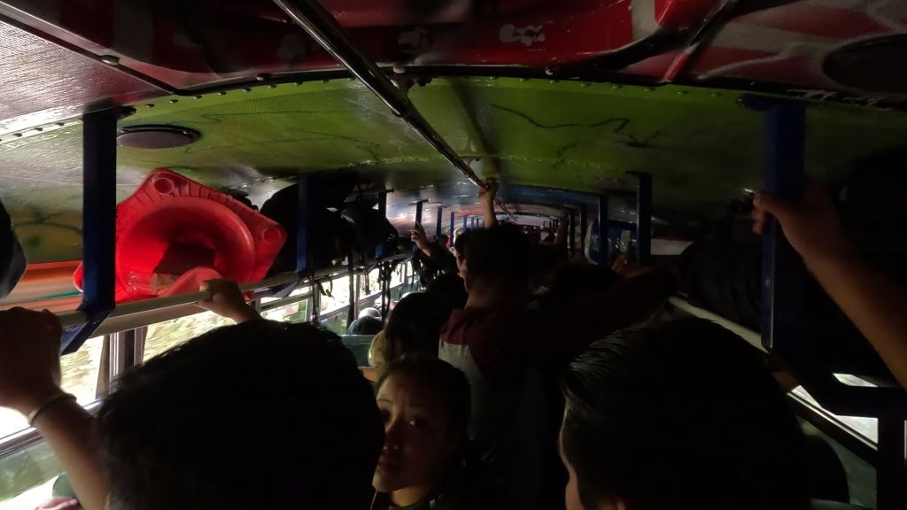 We think the bus must have been waiting to fill up, as it was absolutely crammed full, the doors opened and people were already hanging out, the central aisle full of people standing. We had no other choice but to try and squeeze on too.