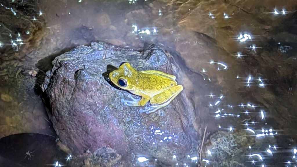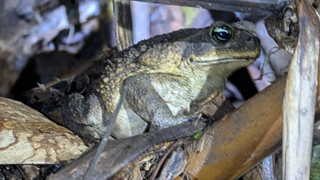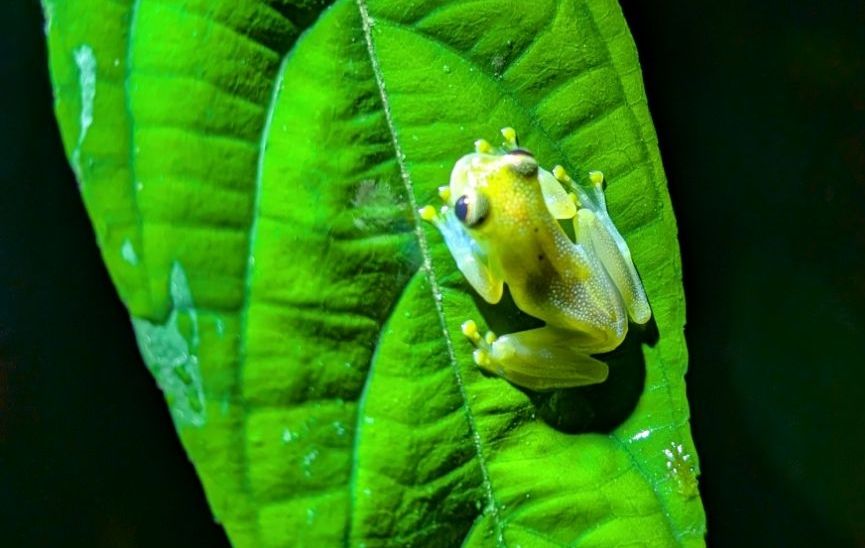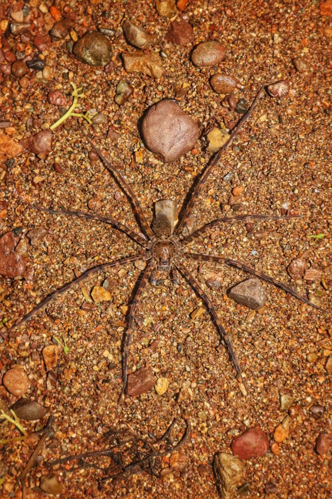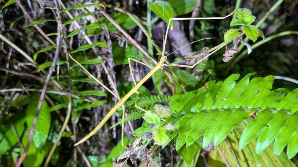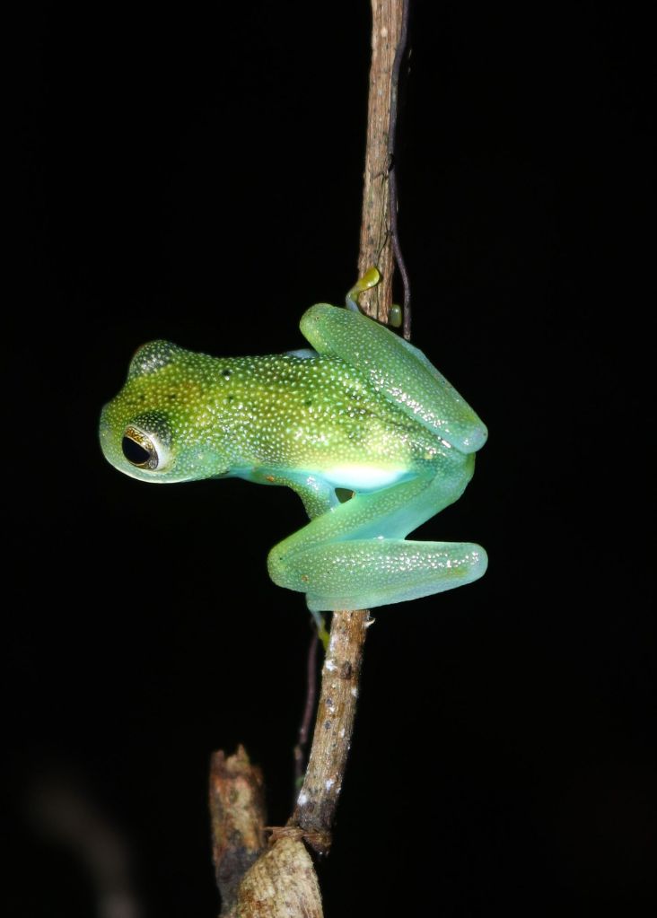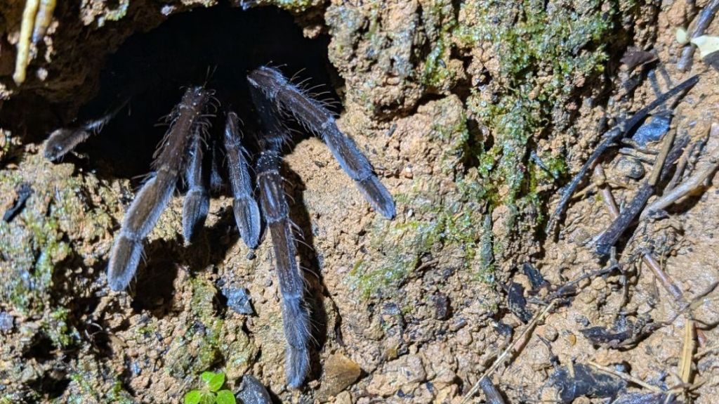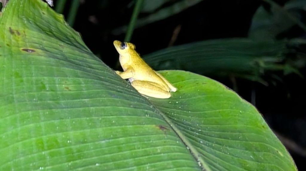 We saw a lot of frogs, mostly poisonous ones and loads of stick insects and spiders, including the water spiders which walk on water. We also saw a few birds, fast asleep, including a kingfisher and a little Manakin, all puffed up and hiding from the rain. We also saw a small snake which mimics the venomous fer de lance, but is safe, and right at the end we saw a highly venomous black tarantula…